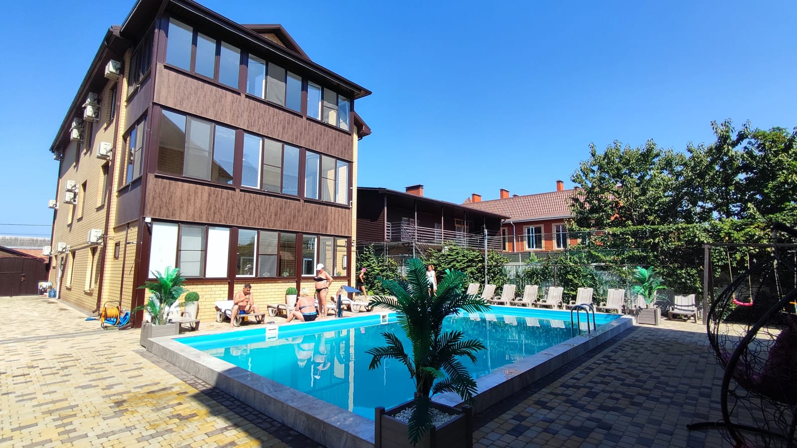 В гостевом доме оборудованы кровати и шкафы для одежды. Так же имеются Wi-Fi, телевизор, есть фен в ванной комнате. В распоряжении гостей находится плавательный бассейн.